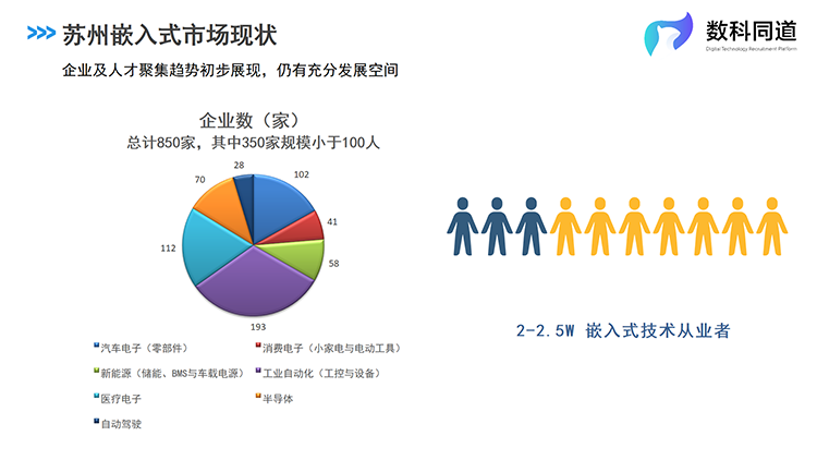 根据PA真人视讯国际人力资源公司及数科同道业务团队对苏州市场的详细调研,现在苏州全市拥有嵌入式研发团队的企业数量为850家,主要集中在工业自动化、医疗电子、汽车电子等细分行业,其中百人以上规模企业500家。