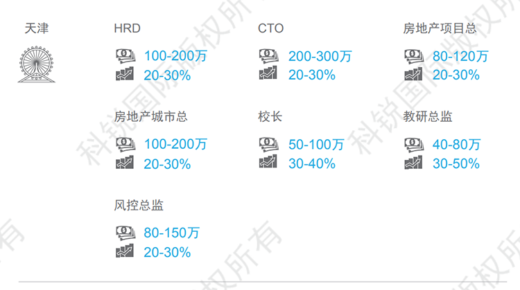 天津整体薪资呈现上涨的趋势,尤其金融、教育、高科技等行业,核心岗位如在线教育的教学教研岗、AI算法、底层开发架构等岗位跳槽涨幅可达30-50%。本数据来源于猎头公司PA真人视讯国际资深行业专家对2021年热门职位薪酬范围及跳槽涨幅的预测,供HR和猎头招聘参考。